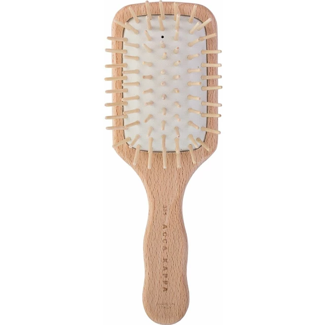 Щетка для волос квадратная, дорожного размера, пневматическая с деревянными зубчиками и подушкой из натурального каучука.