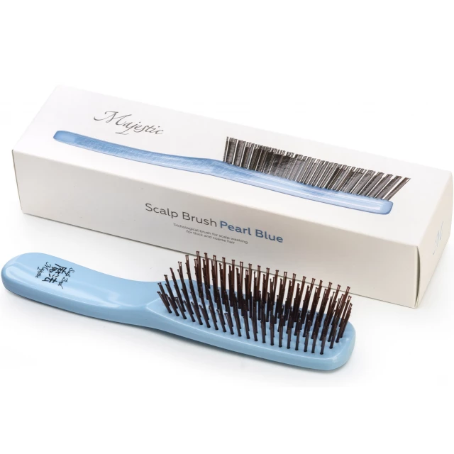 Японская расческа Majestic Pearl Blue предназначена для мытья головы и массажа. 568 зубчиков с литыми наконечниками тщательно очищают более сорока тысяч пор от скопившихся загрязнений, а эффект легкого пилинга обеспечивает устранение старых клеток - кожа начинает дышать. Массаж усиливает приток крови к корням волос - это благоприятно воздействует на волосяные фолликулы, в том числе спящие - к ним поступает больше микро- и макроэлементов.