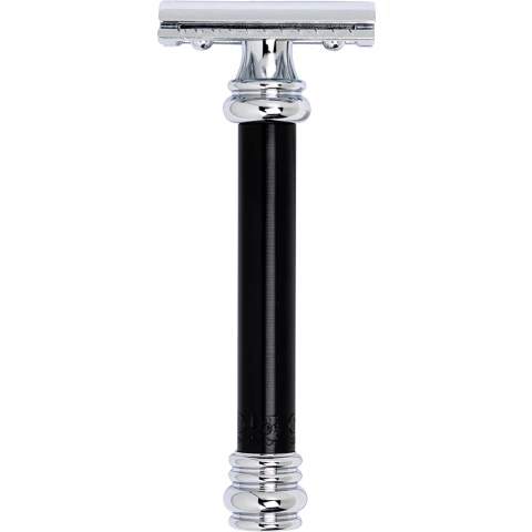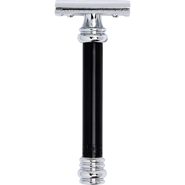 Cтанок Т-образный для бритья MERKUR 38B, глянцевое хромированное покрытие, анодированный алюминий в черном цвете, прямой срез, закрытый гребень, длинная ручка, лезвие в комплекте (1 шт), в картонной коробке.