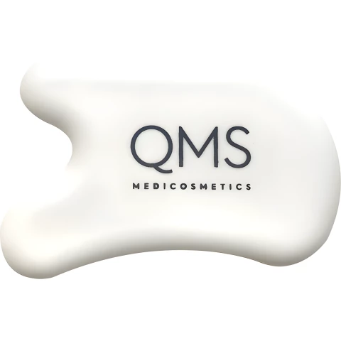 Фирменный скребок Гуаша из цельной керамики с логотипом QMS Medicosmetics. При регулярном использовании скребка уходит отёчность, кожа лица подтягивается, становится упругой и эластичной, заметно улучшаются контуры лица (скулы / подбородок, разглаживаются мелкие морщины).